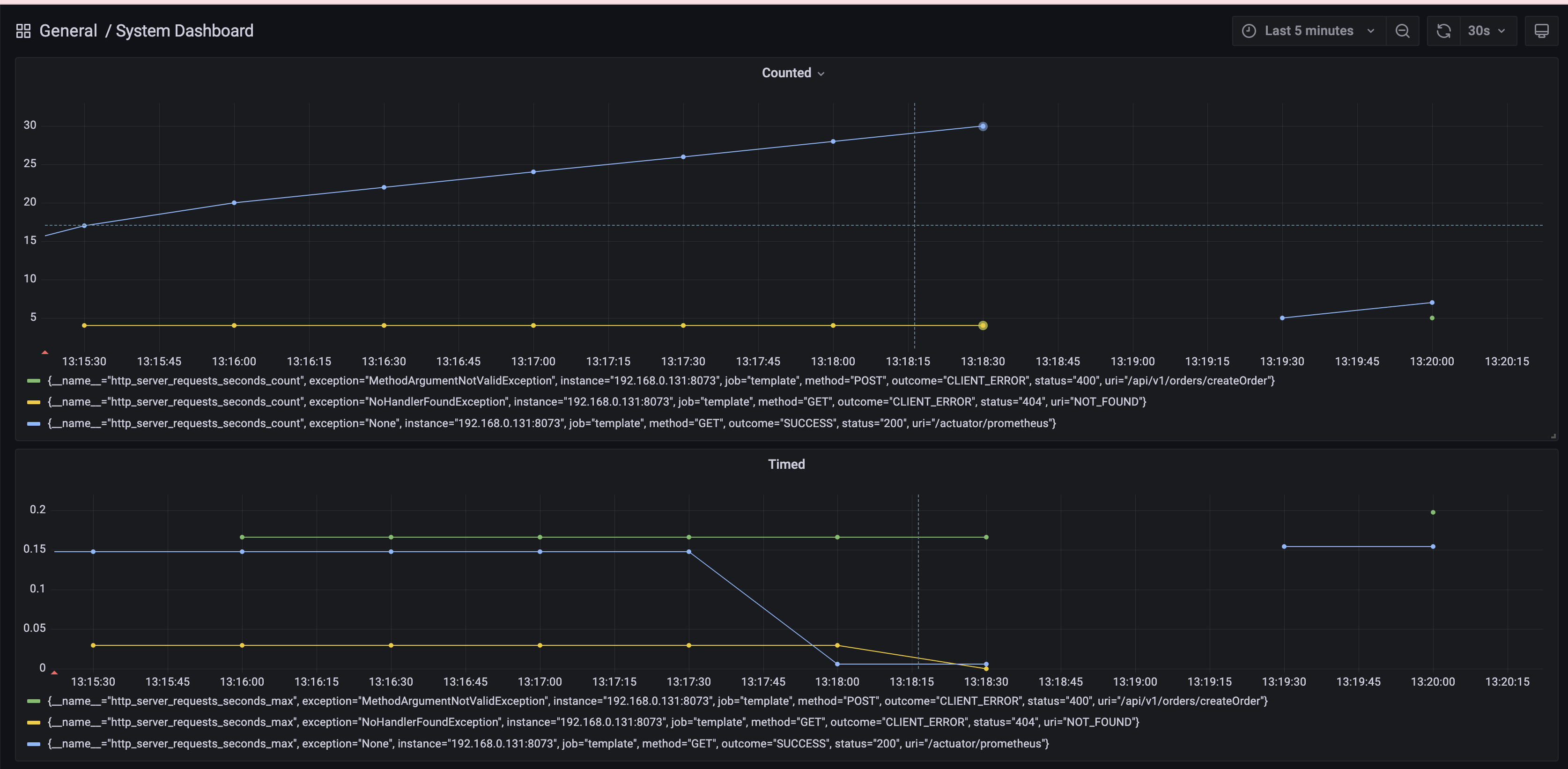 In our application, we use grafana with prometheus. Our requests go first to prometheus and then grafana takes data from prometheus and displays them in the form of graphs. Along with the main metrics, two more were added. This is the number of requests and the time of their execution.