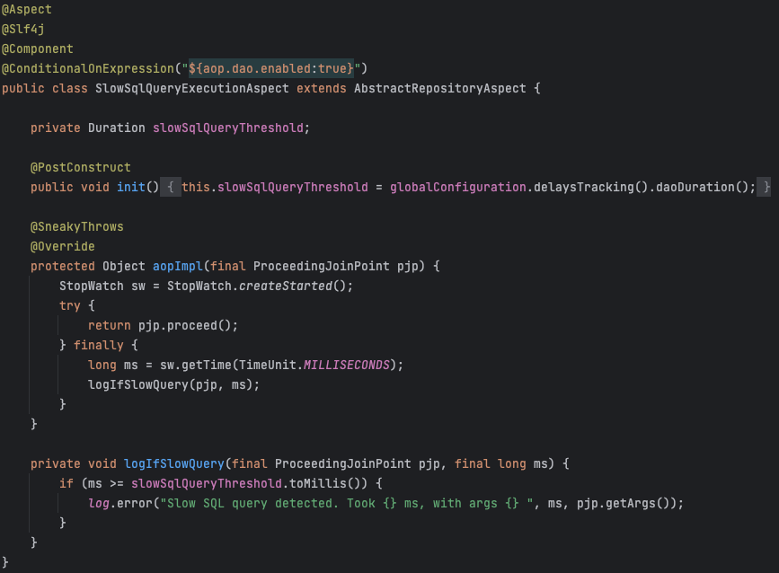 If the execution time exceeds the threshold, the aspect logs the details and notifies the developer that a slow SQL query execution is detected.
